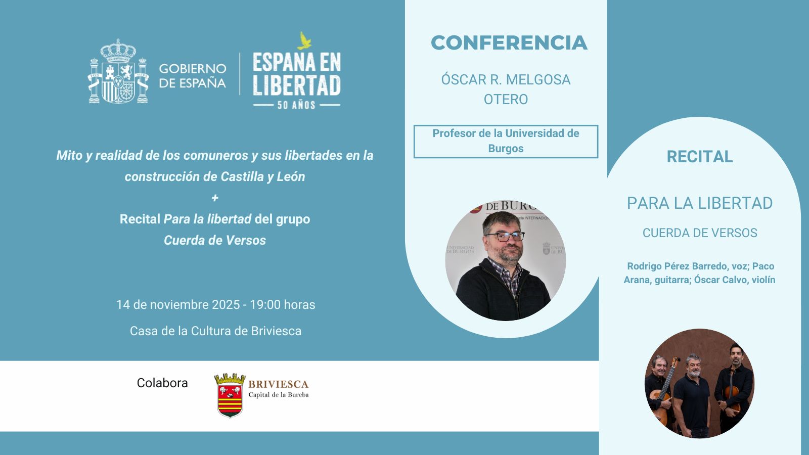 La jornada se completará con el recital “Para la libertad” a cargo del grupo Cuerda de Versos, formado por Rodrigo Pérez Barredo (voz), Paco Arana (guitarra) y Óscar Calvo (violín).